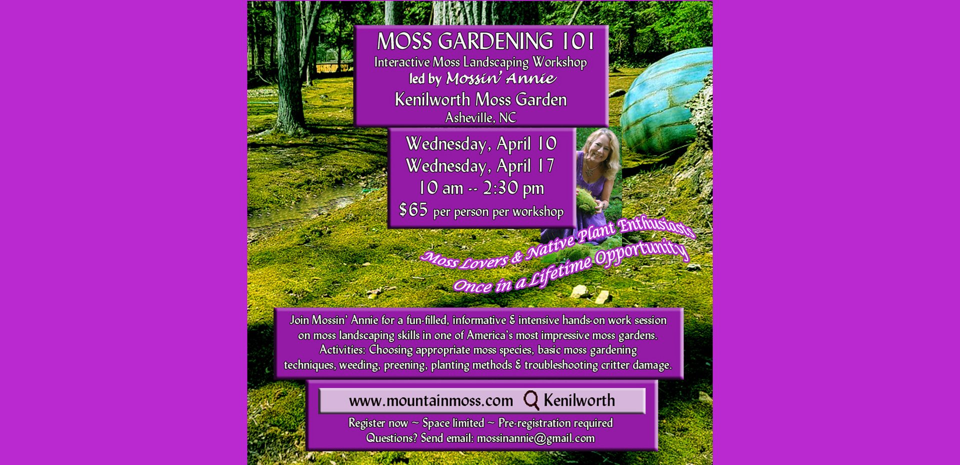 Please contact Mossin' Annie for Lectures and Workshops. By ordering this item you are putting down a non-refundable deposit. This option is offered as a credit card payment method for confirming a contract with Mountain Moss for a speaking engagement or workshop. Contact Mossin' Annie first to make arrangements regarding date and specifics. Re...
